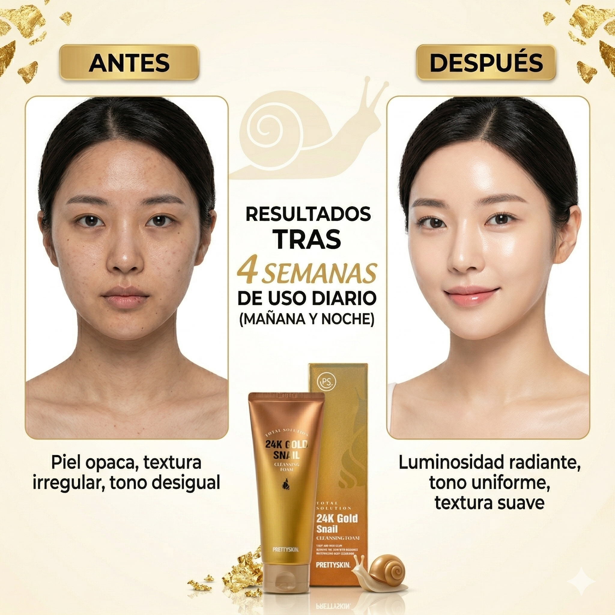 - Enriquecido con oro 24K y extracto de baba de caracol